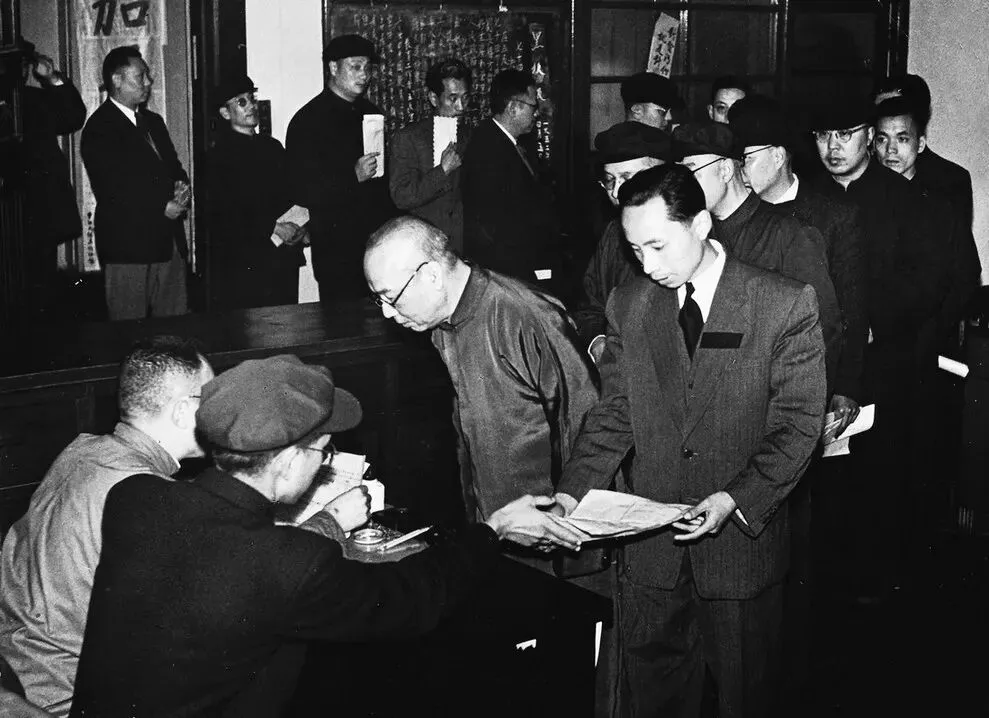 上海黄浦区国际贸易业的资本家排队向“五反”委员会递交“坦白书”。(原载《老照片》第2辑)