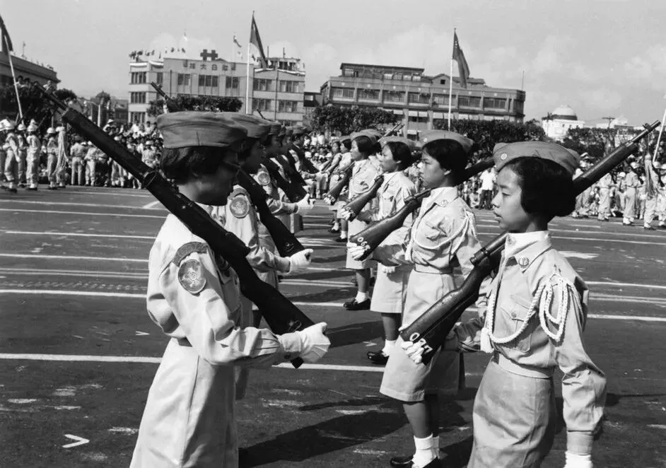 1955年,台北女学生在“双十节”的操枪表演。(原载《老照片》第43辑)