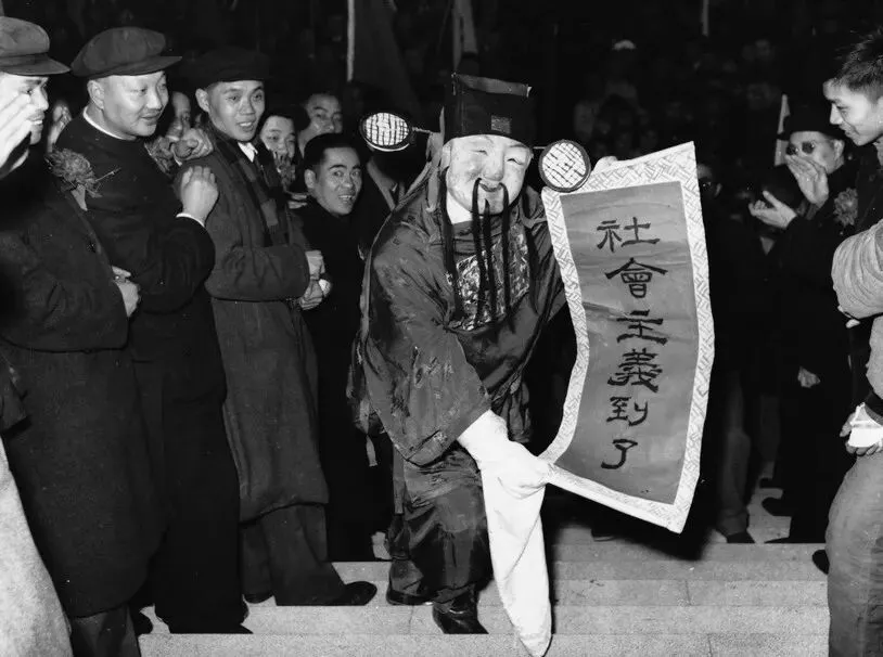1956年1月20日,上海举行公私合营大会,工商界报喜队一位扮作“天官赐福”的报喜者来到了会场。(原载《老照片》第14辑)
