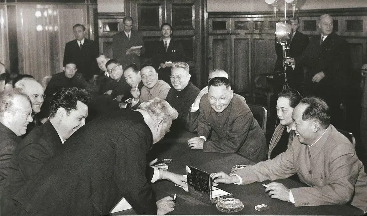 毛泽东(右一)、邓小平(右三)、杨尚昆(右六)在莫斯科时,苏联部长会议主席布尔加宁请他们品尝苏联香烟。摄于1957年。(原载《老照片》第93辑)