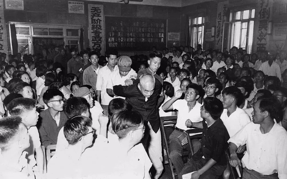 1967年8月10日下午,在人民日报社五层礼堂中批斗彭德怀。(原载《老照片》第94辑)