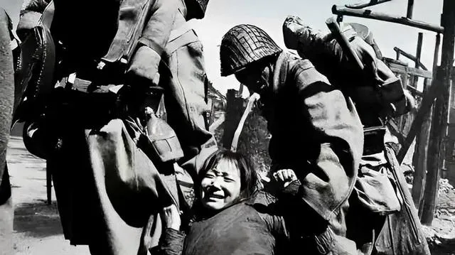 图中这几个身影叫侵华日军,硬壳盔,粗呢军服,背后水壶弹袋一串串挂着,手里按住的是我们无辜的百姓,脸被拽变了形,牙都咬出血丝,街角的木梯还在,屋檐下的影子被搅得乱七八糟,他们下手快,表情却冷得像铁,奶奶说见着这架势,谁还敢出声,能躲的全躲进门后面。