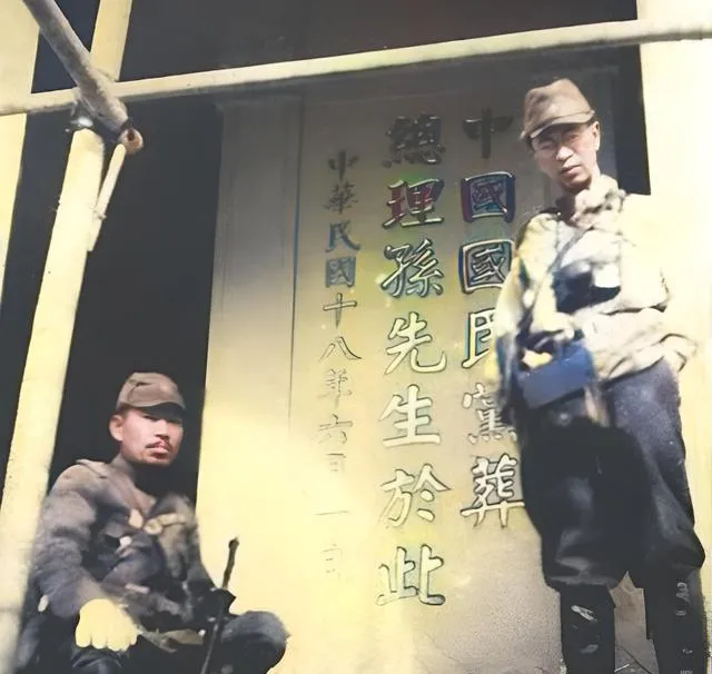 图中这块碑,字清清楚楚写着我们的英烈,两个侵略者却在门前站岗作势,像是在示威,也像在取乐,袖口的布条白得刺眼,门楣上落满尘灰,神情里透着一种不把人当人的轻慢。