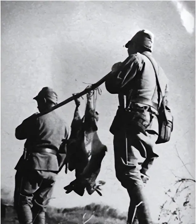 这张看着像是在搬运战利品,两人用枪托挑着东西,背带勒出一道深痕,脚下草根被蹚断,他们把掠夺当本事,笑得放肆,谁家院里要是被看上了,可就难保了。