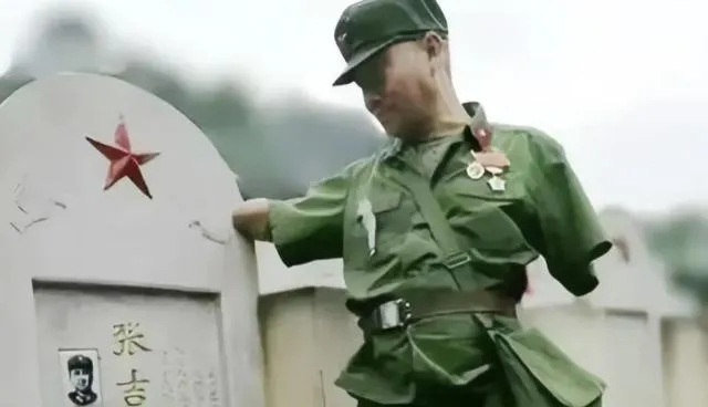 这位老兵没有双臂,军装袖口被整齐地缝住,他靠肩膀轻轻碰一下墓碑,就像从前在阵地里碰一下战友的胳膊,胸前挂着的功勋不响,风吹过来,红星在光里一闪一下,话没出口,意思全在动作里了。