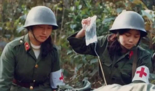 两位女兵戴着钢盔,袖口红十字很醒目,一人举着输液袋,一人按着绷带结,针头抖一下又稳住,谁都没说累,风里全是药水味和潮土味,她们抿着嘴,眼神却很硬,很稳。