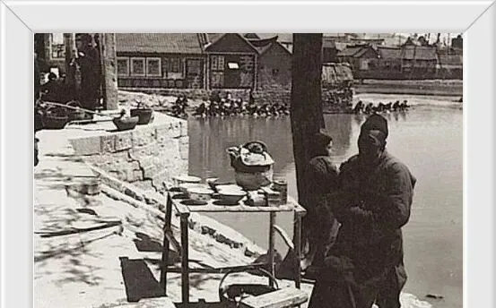 这几张是更早的景,清末的庙会人群挤到屋檐下,人声像浪,旁边两张老屋檐子是传说里狄青梳洗台,石阶被水磨得发亮,门前一口香炉老得可爱,最后这张河边小摊,热水壶蹲在炭火上,卖茶水的老人盘腿坐着,一碗一文钱,妈笑我嘴馋,给我添了一勺白糖,那时候天一黑风一凉,人也慢慢散了。