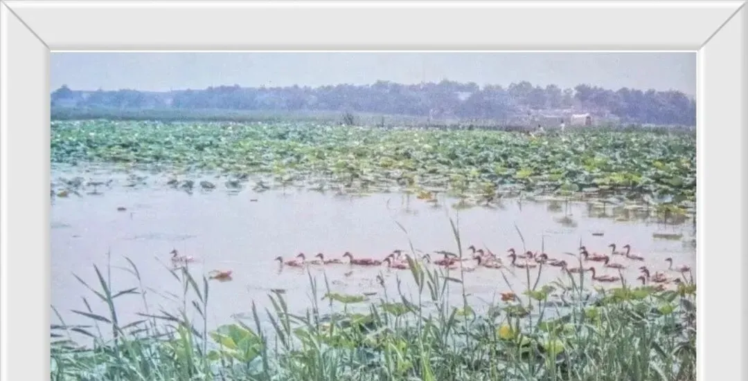 黑白的这一张是解放淮阳城南门的见证,城砖驳驳,洞门口排着炮车,人站得笔直,历史像在眼前定格了一下,紧接着这张水面上排着一串小点的是龙湖的野鸭,荷叶铺开到天边,风把水面一层层推过去,呼吸也跟着顺了起来,现在湖边步道修得齐齐整整,游客多了,鸭子一惊飞起来又落下,还是自在。