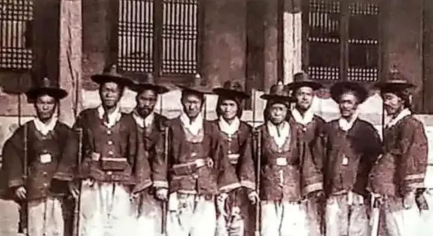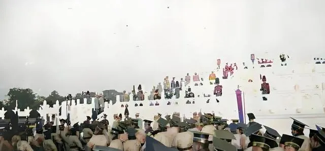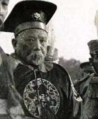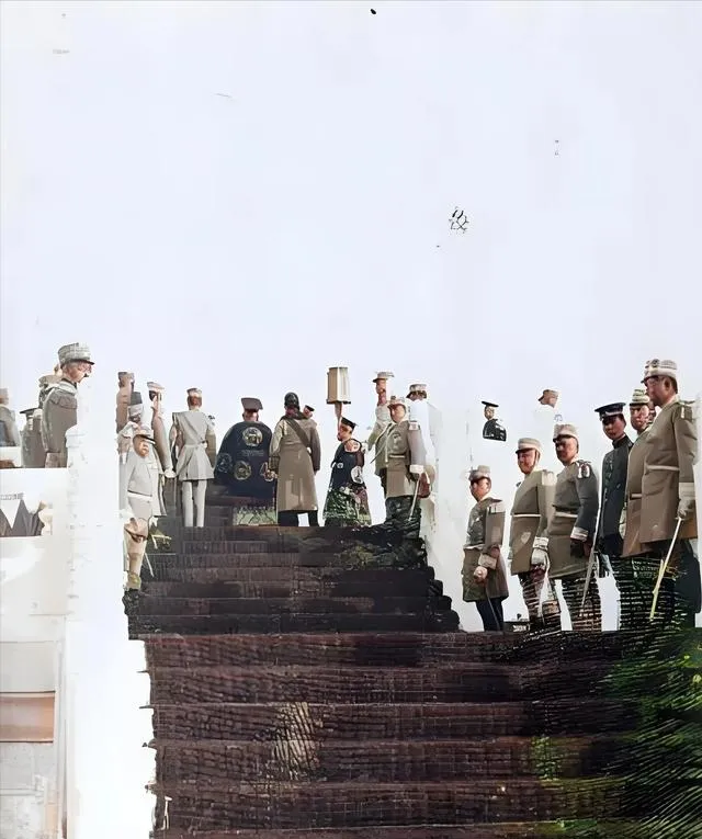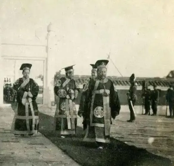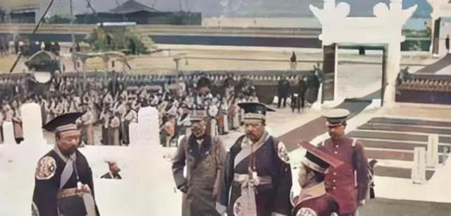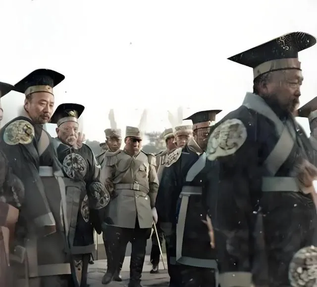 图中这一身朝服叫朝袍,硬挺的绫缎做底,圆补绣着团龙,黑檐乌纱压在额头,脚下官靴一步一停,身边随从的佩刀亮起一道冷光,表面看人多势众,往里看脚步并不齐,鼓点像被风掀了一下,远处站的洋兵帽上白羽毛直直翘着,热闹是热闹,威是散的。
