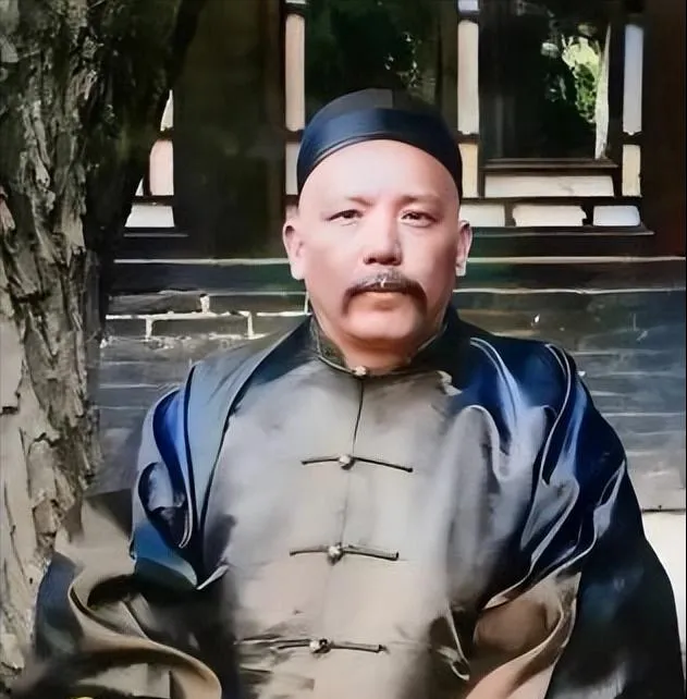 图中这身黑缎长衫叫长褂,油光一抹,袖管肥大,坐在树荫下不笑不怒,嘴上留着一抹胡,扣子绾得很紧,姿势端得住,劲儿却是向内收,像一口压着火的炉子,手边没有兵符也没有刀,只有一张石阶把人往后压住了。