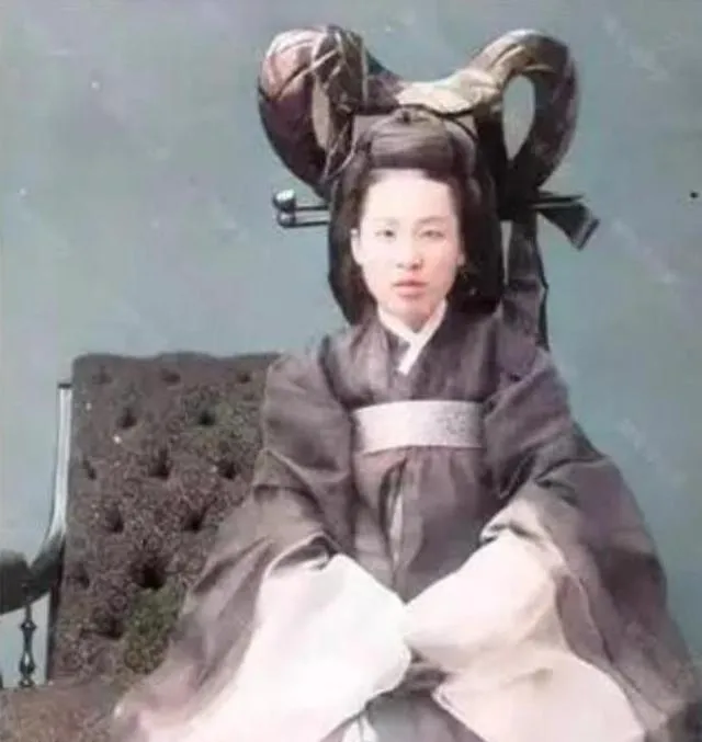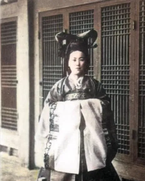 图中这身高髻宽袖叫朝鲜礼服,发上绕着厚厚的假发垫,正中一个簪台压住,两袖铺开像一对展开的扇,坐像稳着不动,站像略略前倾,衣料是重的,表情是安静的,外路的装饰在屋里一摆,颜色挺新鲜,心里那点不踏实也跟着冒出来。