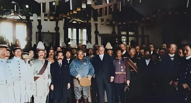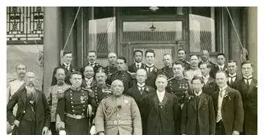 这处屋檐下的合影叫洋场局,制服礼服并排站,西装翻领里塞着花,握手的人笑得刚好,腰间军刀鞘口一闪,屋里悬着各国旗带,彼此都打量彼此的底线,碰杯是喝,试探也是喝。
