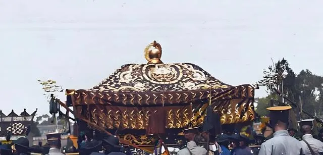 这顶金色的大伞叫华盖,顶心一粒宝珠,伞沿下垂缨络,阳光一照金灿灿,几只手把杆子抬稳,风要把边角掀起来,手腕一紧又压住,华盖走在前头,主位走在后头,远看威风,近看是累。