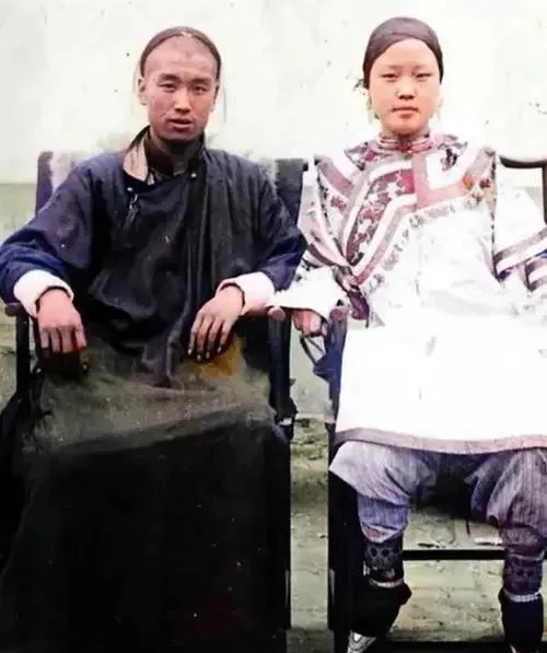 图中并肩坐着的这对新婚夫妻,一个西式椅子,男子头剃得溜光,穿得宽大,女人的上身花色鲜亮,衣角处有层层叠叠的绣线,裤腿卷得脚腕干净利落,小脚一并,双手搁在腿上,神色不娇也不拘,透着一股认命但又不肯懦弱的劲头,这种合影放到那个年代,是一大家子的面子活儿。