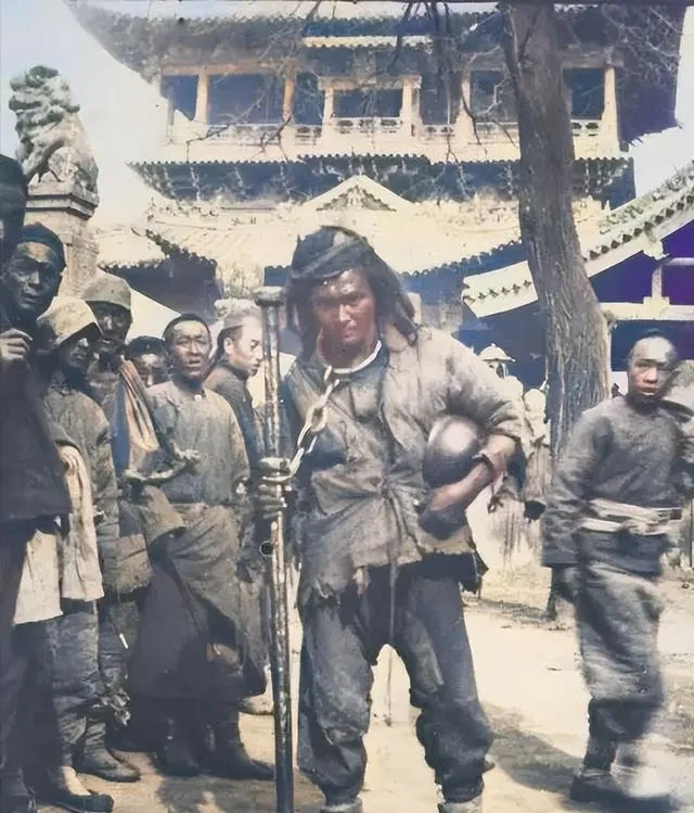 这个画面劲道大,手里拿着枷锁,一身破棉袄,帽子歪着扣头上,脸被煤灰糊得分不清五官,脖子上吊着铁链子,身后一串人跟着围观,这就是清末街头最常见的场景之一,老爹说小时候见过这种押街,看着吓人,没人敢靠前。