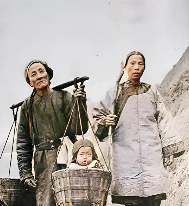 图片里两位妇人一身麻布衣裳干练利落,杆子一撅扛在肩头,挑着两个大竹筐,筐里坐着小孩,毛绒帽把娃脑袋包得严实,神情有点呆,眼里却透着灵气,这种挑着娃干活的法子,旧社会山里人家最常见,做工走亲戚全靠这身力气。