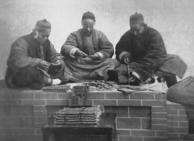 这个画面叫地主坐炕头数钱,三个人盘着腿,面前摆满了铜元和各种古钱,劲头正足,算盘噼里啪啦,细致地划拉着账本,附近的大爷曾经咋呼,地主家的人有钱能堆成小山,数到手酸,老百姓想碰都碰不上,可钱再多,一朝翻身也就什么都不是了。