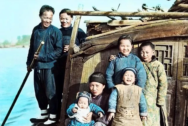这是一家人在船头合影,满脸都挂着笑,孩子窝在怀里,身后的水光粼粼,老的少的一起挤着,那个年代水上讨生活的大有人在,一根篙子撑起一家人柴米油盐,日子虽然苦,人心踏实,谁都知足。