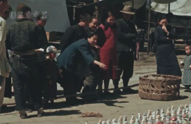 孩子和大人围着地摊玩投壶,笑声和“哎呀差点儿中”的呼喊,最地道的街头小乐趣,图里一位大姐一边扔一边还指导后头的小家伙,也没啥奖品,玩的就是个高兴,叫人隔着年月都能笑出声。