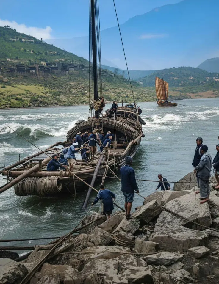 他们知道,每一次与急流的角力,都是为了家里的炊烟,为了山坳里的妻儿。木船载着盐巴、布匹与希望,在险滩里辗转,把巴蜀的物产送往山外,也把外界的消息驮进峡谷。