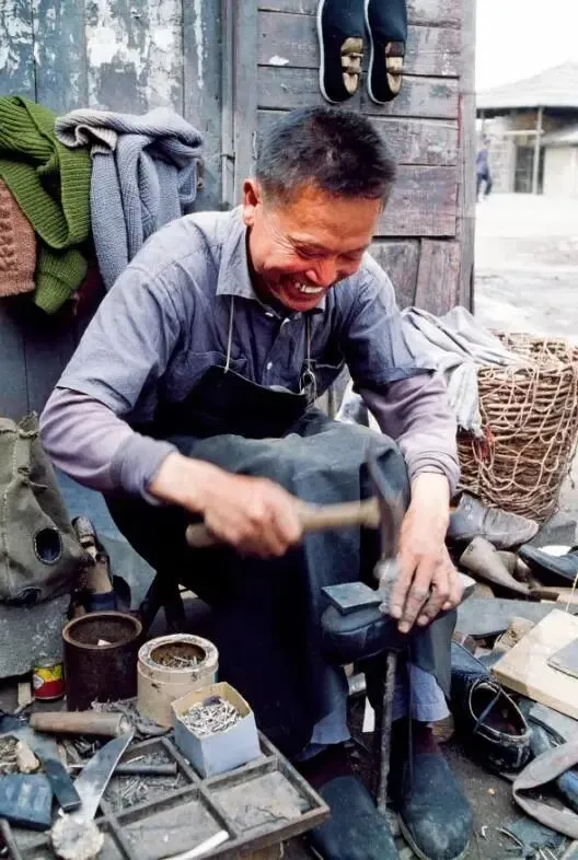 80年代的一位皮鞋匠,笑得乐呵呵的。虽然工作不算体面,但他一个人的收入,却足够养活一家老小。