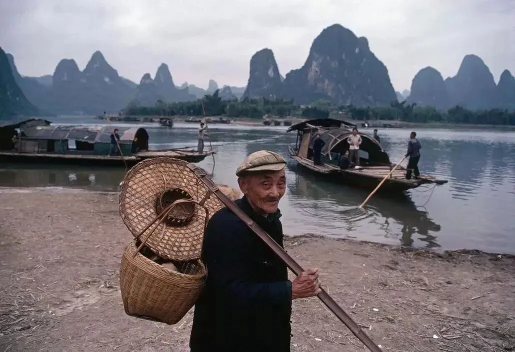 80年代的桂林山水,一个游客也看不到,只有当地的传统渔夫。照片前方,是一个背着斗笠、竹框的大爷。