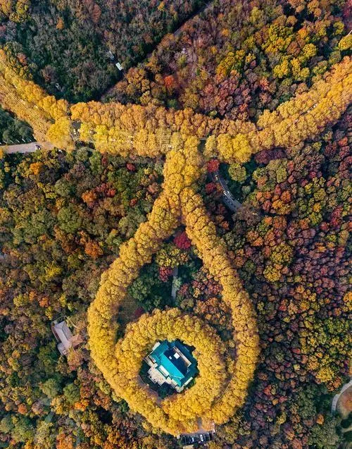 这个鸟瞰角度有意思,一串梧桐把山腰绕了个圈,正中一点蓝屋顶像珠子,路从林子里拨开,像谁在地图上画的项链,风一吹叶子抖,落叶铺一地,后来人说这是为爱人栽的树,走在树荫底下,脚步轻点也能听见心事落地。