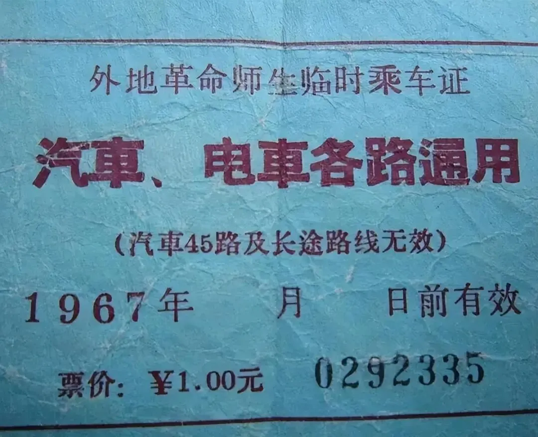 这是一张1967年的临时乘车证面值1块钱。这是一张通票,拿着它可以在北京免费无限次乘车。