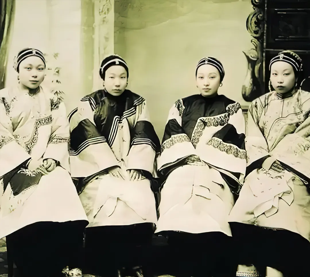 这是晚清一大户人家的妻妾,中间坐着正房两边是小妾,正房的颜值即使是现在也是美女,何况是在那个年代。