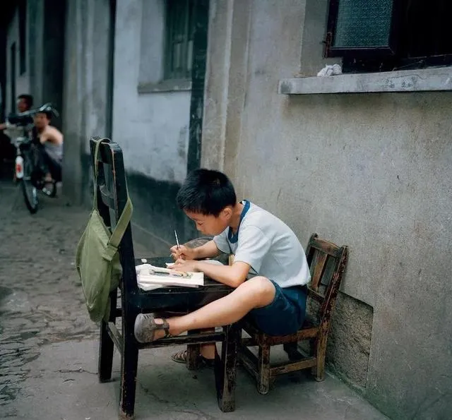 这孩子坐着小马扎,门口一张斑驳的桌子配个小板凳,胳膊搁在桌边打着草稿,帆布书包随手一挂,墙根底下凉快,写着写着风一吹,作业本页页直响,把马扎倒着一砸,凳腿有时候还少一根,坐得蹲蹲的,妈妈总说“再写歪了就不让你出门玩了啊”,放学回家,饭前都得在小凳上完成任务,现在书桌书架一套一套的,真正静下心来的孩子没几个。