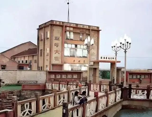 这张校门口的照片,四方楼上写着“业精德诚”的字,前头有桥栏绕着水面,两个学生扒着栏杆说悄话,旗杆直直插着天,放学的铃一响,队伍沿着桥面慢慢散,书包角在背上蹭来蹭去,校门外那点小卖部估计也很忙。