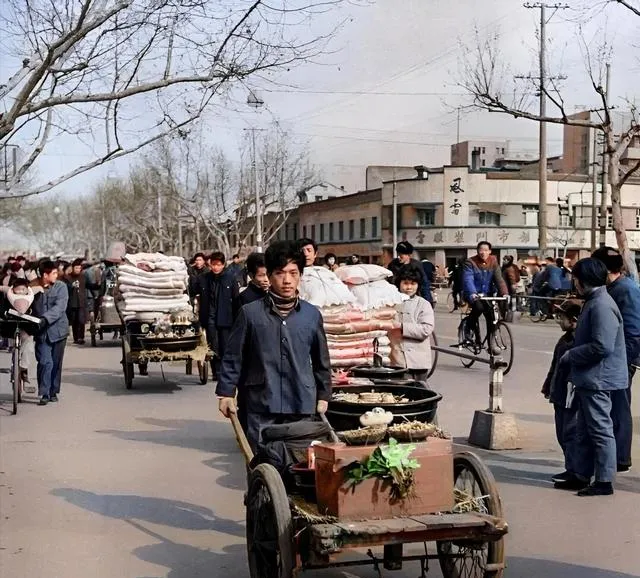 照片里这一溜手推车,前一辆摆着花生瓜子,后头叠起厚厚的棉被,走在最前面的男人低头使劲,街坊在路边笑着看,结婚的阵仗不靠豪车靠人气,妈妈说那会儿嫁妆讲究实在,锅碗瓢盆装满满,推回家就是日子开张。