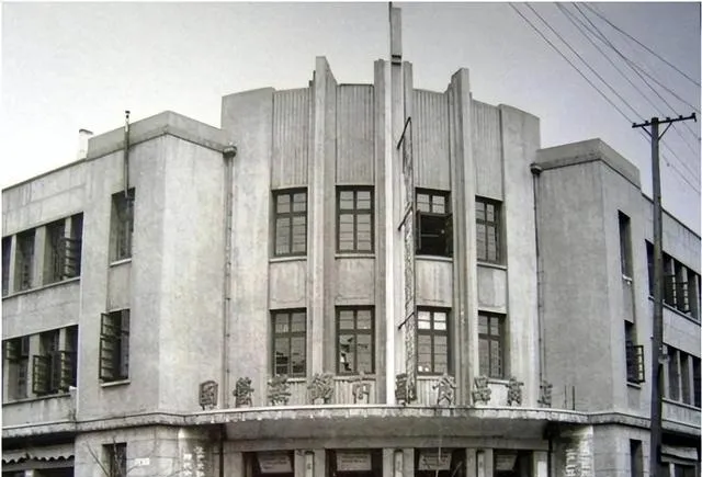 这栋立面有点讲究,竖线条一路提上去,牌匾横着压住门头,应该是戏院或电影院,门口贴着海报,票窗开个小口子,叔叔说他第一次看电影就是在这类馆子里,木椅子有点吱呀,灯一黑,全场安静得能听见咽口水。
