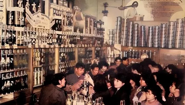 这个室内一看就是商场的柜台,墙上一排排保温瓶反光刺眼,玻璃后面还码着饭盒,前面的人把票攥在手心里,售货员递过来让验一眼,合适就包上,那时买东西先看票,再看钱,再看货,现在手机轻轻一点,东西就送到门口。