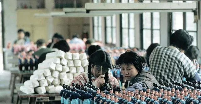 图里的工厂在做泥人,女工们穿着围裙低头抹色,桌面上一溜排开的小人儿站得笔直,有人把辫梢别到耳后,手腕在灯下亮亮的,师傅凑过去压低声说“这道边再薄点”,我在旁边看着就觉得眼睛酸,这活细,手稳,屋里静得只剩下刷刷的笔毛声。