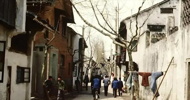 最后这一张是老巷深处,梧桐枝丫探到巷心里,墙面斑驳,绳子上晾着蓝布裤,骑车的人叮铃一声从背后闪过去,行人让出半步,话还没说完人已到尽头,那时候的生活不快不慢,现在节奏上了弦,可只要一拐进这种巷子,心里就安稳下来一点。