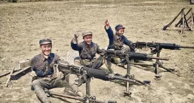 图中这排长枪叫重机枪,黑乎乎的水套一圈一圈,三脚架落地像钉住了,战士们蹲在土里,手搭着握把冲我笑,说一会儿试射,泥点子甩起来可别躲,你看他们的裤腿全湿了,训练场上风大,心却热得很。