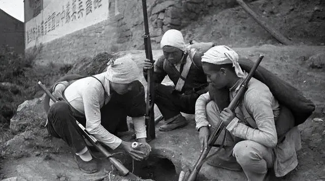 图里这活叫埋雷,铁铲探下去,汗顺着头巾往下滴,三个人一呼一应,谁都不多说,手上慢,心里更稳,旁边土墙上写着标语,抬眼一看就知道该干啥。