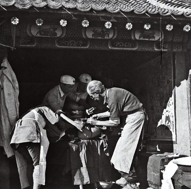 这一串叫救护线,白袖套上有红十字,扶着伤员问得细,前头摩托一轰就走,后面搭手术台的地方是庙檐下,手电夹在齿间,钳子一递一接不肯出差池,我妈看见这几张总要叹一句,以前哪有条件,现在手术灯一亮屋里像白天。