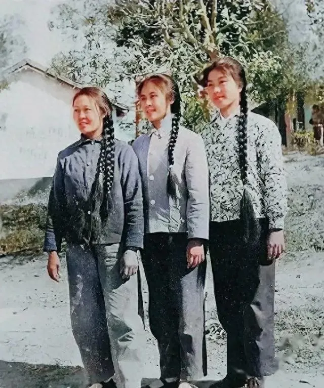 这张照片里,三个女知青站在院子外面,太阳一晒,衣裳颜色分明,灰蓝、石绿色、素净的花布衣,小立领、大纽扣,麻花辫挨在胸前沉得很,梢子油亮亮的,看得出是家里老娘天天抹梳油绳拧出来的,她们笑起来就像村口那塘水,真得不能再真,眼里没有半点擦边球,只是年少的自信,站姿也比一般人利落,衣服有补丁也不见自卑,风一吹,都在精神上,不是装出来的漂亮,是骨子里的自豪感。