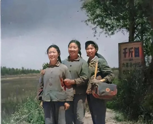 三位女知青胳臂挽着胳臂,站在田头路边,天很蓝,身后的牌子上印着“千斤田”,胳膊搂得紧乎,衣服平常得很,全是土布大衣和简单斜挎包,笑容晒得透亮,路边草野都被她们的精气神提亮了不少,现在的明星拍硬照得整几百张才挑得出一张满意,当年的姑娘一个抬头就入画。