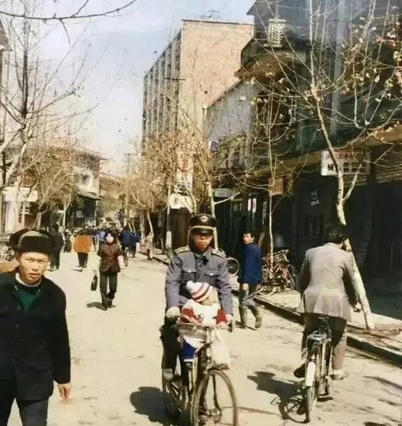 树枝秃了,街上都是穿呢帽棉衣的路人,警察骑车前头顶个皮帽,后座绑着小孩,家里的小朋友冬天都裹成团,还能被爸爸夹在自行车杠上摇晃到幼儿园,街道边人来人往,那个时候天冷路滑也没谁骑电动车,都是靠腿和力气。