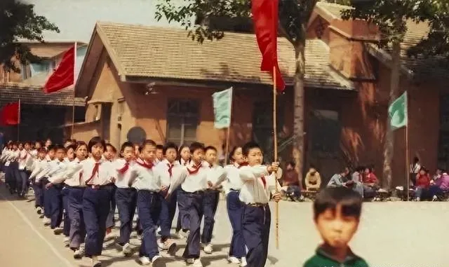 这个画面一看就耳熟,图中穿着蓝裤白衬衫的小学生,胸前的红领巾特别鲜亮,排成队举着小红旗,迈着正步走在学校操场上,那神气劲别提多让人羡慕,当时哪家孩子要是谁能当上旗手,在家都能抬头挺胸好几天,后面是老砖房,树荫下坐着的多半是老师和家长。