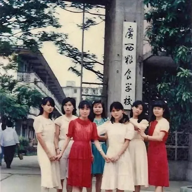 这群姑娘搂着站在学校门口,七八个像花儿一样,穿着素净的连衣裙,有人偏偏选了红色格外扎眼,门口的水泥牌子上毛笔写着学校的名字,开学前后或者毕业,总得站这留张影,有人害羞抿嘴笑,有人眼睛转来转去。