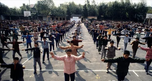 操场上黑压压一大片,男孩女孩胳膊平伸着,站得定定的,广播响一声,动作立马跟上,校服不算讲究,深色衣服居多,最前面站的是带队的班长,每个班队形拉得巨直,好像尺子量过。