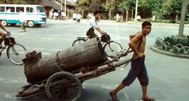 图里男人褪了上衣,拉着手推车,车上搁着硕大的木桶,桶底还往外滴水珠,夏天走街串巷送水去,人迎着太阳笑,汗珠子挂脖子上,路边是自行车和拖拉机呼啦啦带风。
