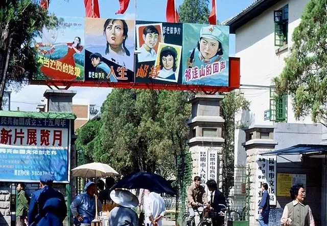 电影院门口那块横幅,印着四部老电影的头像,各种表情,红底黄字,吸引人驻足,大人小孩等着开场,有人骑着单车就直接停门口,票在手心攥紧怕丢了。