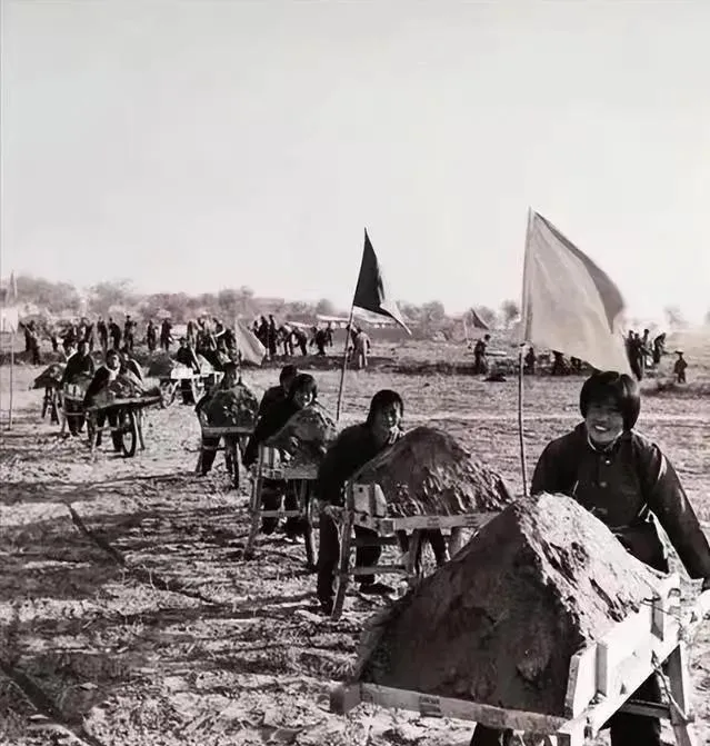 图里女社员推着独轮车,堆得跟小山似的泥巴,一排人旗子一招呼就冲在前头,这活儿是真不轻松,他不是啥力气活都能干得下来,累得咬牙就为能多挣点工分,有的干完活手心磨起泡还乐呵着笑。现在修水利大多靠机械设备,过去靠的是人拉肩扛的死力气。