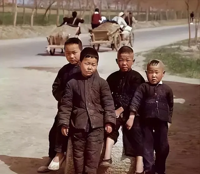 这几个小孩,穿着补丁摞补丁的衣裳,站在路口一脸严肃,头发剪得整齐,眼里都是“我们家穷但我们能干”。后头还有手推车,村里的主干道,来往也就是牲口车和脚踏车。现在的农村孩子,谁还见得着这股子精气神。