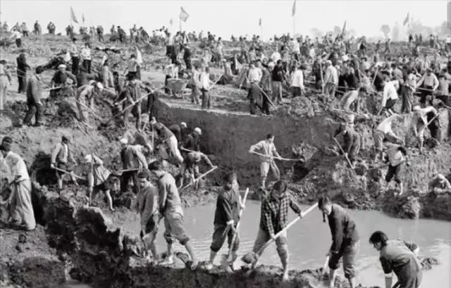 图里女社员推着独轮车,堆得跟小山似的泥巴,一排人旗子一招呼就冲在前头,这活儿是真不轻松,他不是啥力气活都能干得下来,累得咬牙就为能多挣点工分,有的干完活手心磨起泡还乐呵着笑。现在修水利大多靠机械设备,过去靠的是人拉肩扛的死力气。
